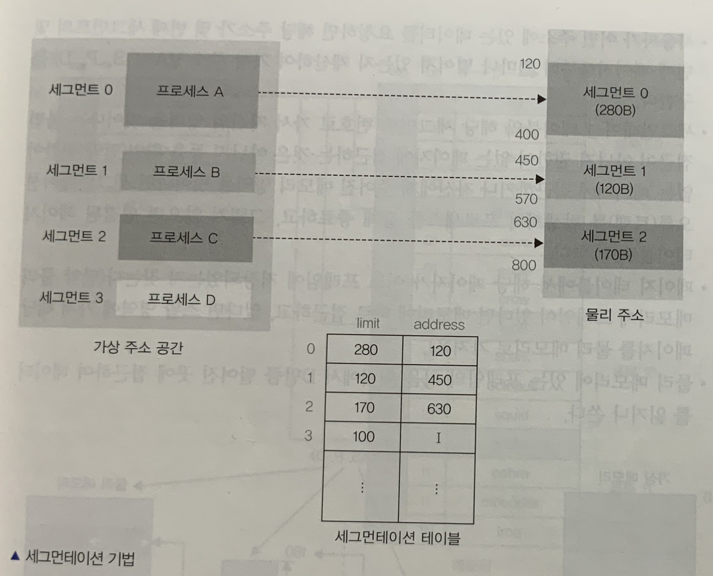 크기가 100B인 프로세스D(세그먼트 3)가 스왑 영역에 있고, 세그먼테이션 테이블의 Address에 I(Invalid)라고 표시되어있다