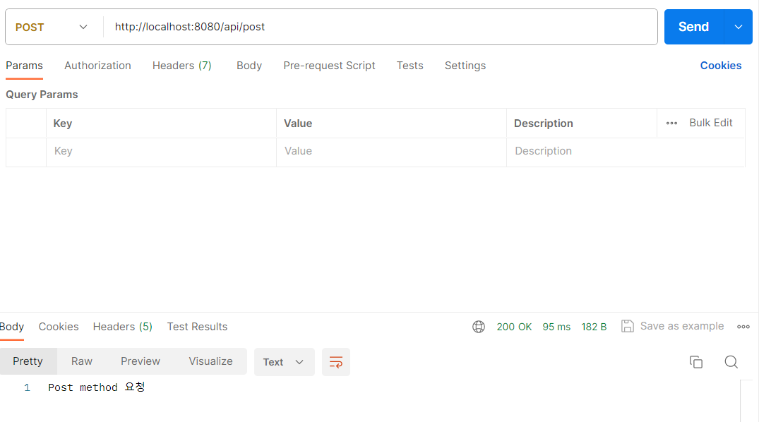 Postman 에 GET>http://localhost:8080/api/hello>Send