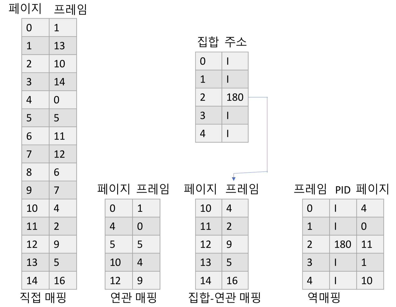 집합-연관 매핑 : 연관 매핑의 문제를 개선한 방식으로 모든 페이지 테이블을 스왑영역에서 관리하고 일부만 물리 메모리로 가져오므로 페이지 테이블을 일정한 합으로 자르고, 자른 덩어리 단위로 물리 메모리에 가져옴