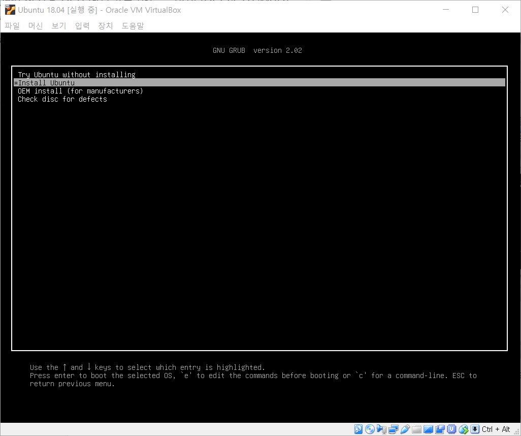 9. 부팅시 보이는 grub 메뉴에서 Install Ubuntu 선택하고 엔터 입력함
