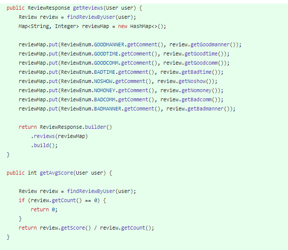 이렇게 짜다가 ReviewRepository 너무 여러번 조회하길래 그냥 한번만 조회하게 바꾸고 그 Review들의 List를 이용하게 함