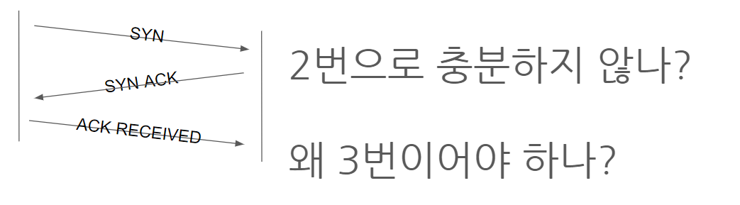 서버가 보낸 요청을 클라이언트가 받을 수 있는지 한 번 확인하는 과정이 필요하다고 함(SYN ACK,ACK RECEIVED)