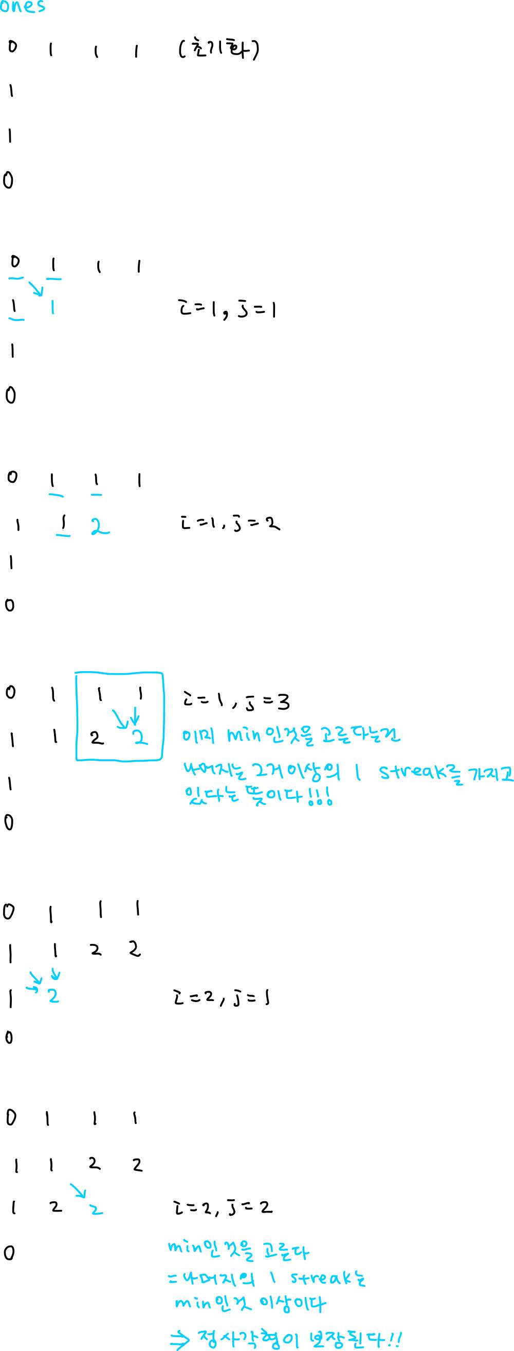 -> ones[i-1][j] , ones[i][j-1] , ones[i-1][j-1] 중의 가장 작은것에 +1 한다