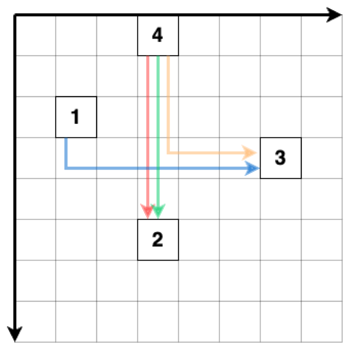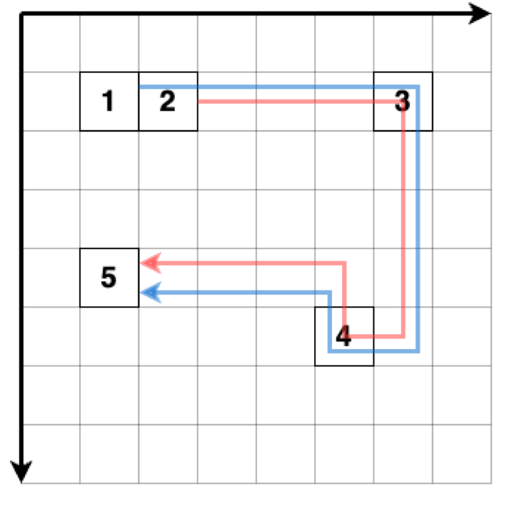 - 마지막 포인트에 도착한 로봇은 운송을 마치고 물류 센터를 벗어납니다. 로봇이 물류 센터를 벗어나는 경로는 고려하지 않습니다.