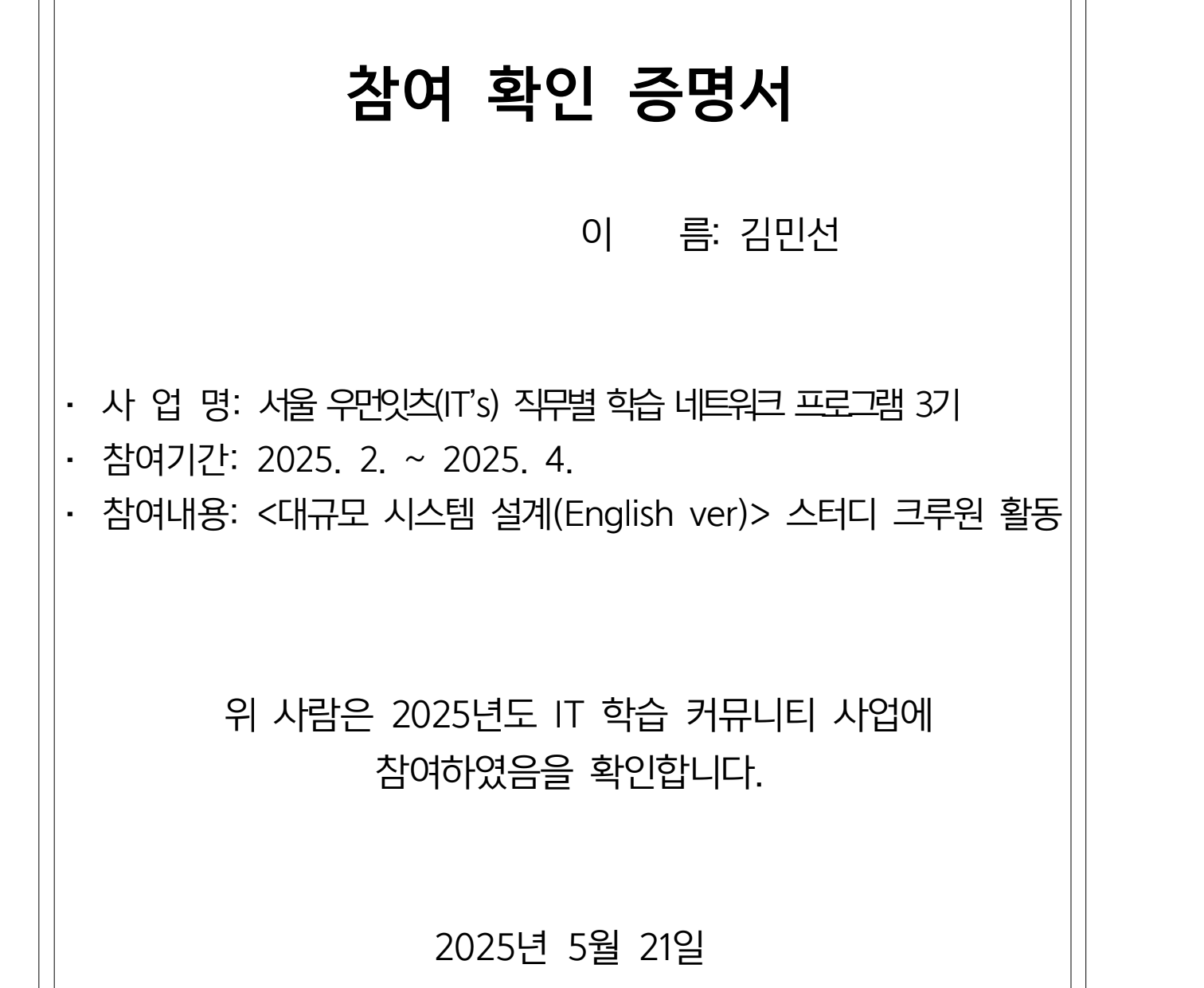가상 면접 사례로 배우는 대규모 시스템 설계 책이 공부하고 싶기도 했고 영어면접 준비에도 관심이 있어서 두 가지를 동시에 하는 스터디에 들어갔다. 책의 주제별로 관련 경험이 있으신 분이 정리해온 이력서를 바탕으로 매주 영어 Mock System Interview를 진행했다. 나보다 경력이 많으시고 쟁쟁한 서비스 기업에서 다양한 경험을 하신 분들과 함께하다 보니 인사이트를 많이 얻었다. 특히 3~7년차쯤 되면 무엇을 질문하는지, 어떤 질문에 대비하는지가 보이기 시작했고 저연차인 나도 설계 선택의 근거(트레이드오프, 병목, 장애 대응)를 질문하며 사고의 기준을 확장할 수 있었다. 동시에 시니어들이 어떤 기준으로 설계를 설명하고 검증하는지도 관찰할 수 있었다. 그리고 무엇보다 다들 열심히 사시는 분들이다보니 만날 때마다 에너지를 얻고 동기부여가 되는 점도 좋았다.