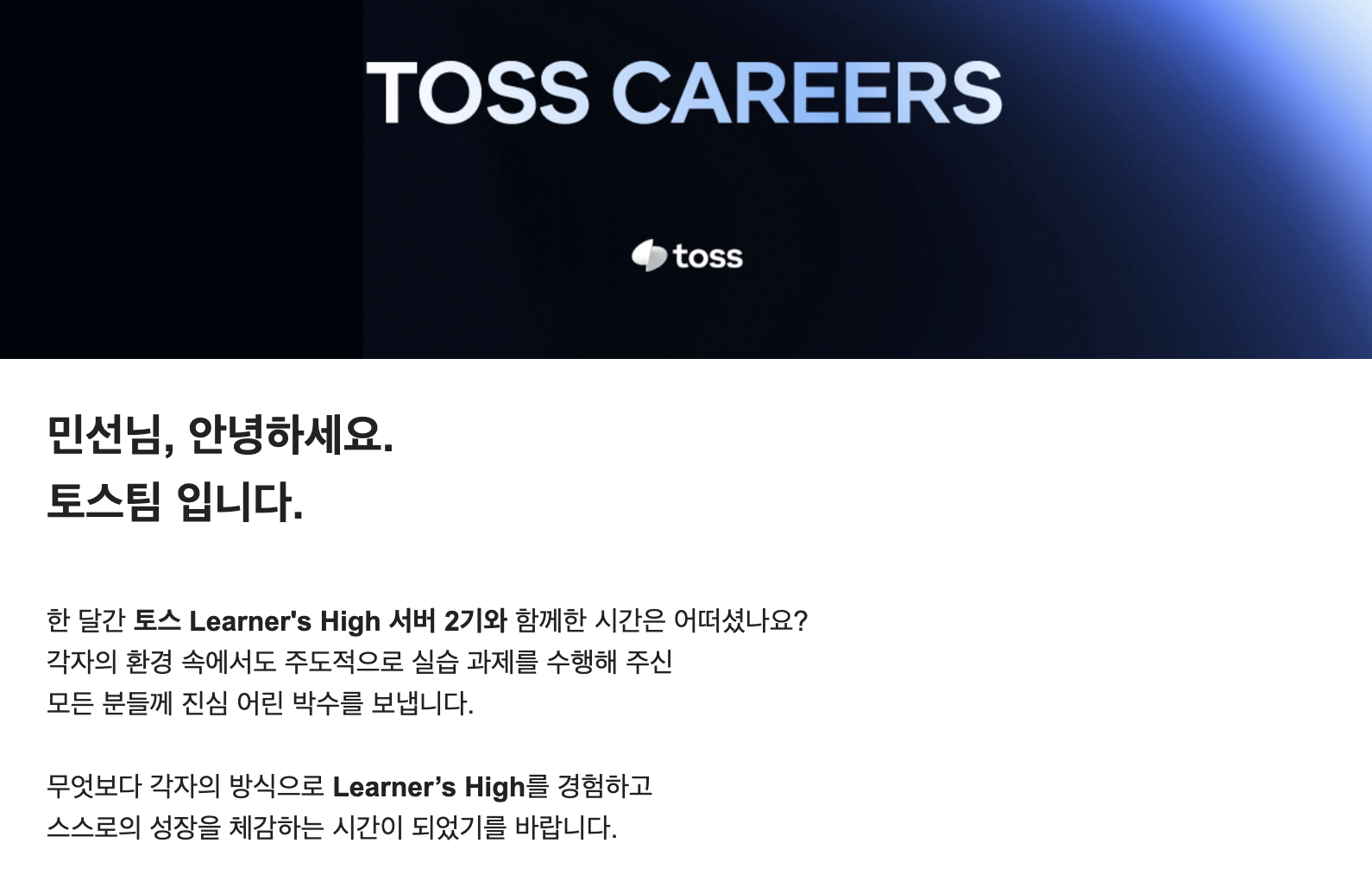 기존에는 회사에서 하는 일이 나의 미래 커리어에 어떤 식으로 도움이 될까를 주로 생각하며 일했었다. 토스 러너스 하이를 하며 내가 지금 회사에서 하는 일에서 어떻게 임팩트를 낼 수 있을지, 회사가 정말 필요로 하는 문제는 무엇인지를 고민하며 일을 하는 경험을 하게 되었다. 그 과정에서 일하는 태도 자체가 한 단계 성숙해졌다는 느낌을 받았다. 그리고 내가 하는 일을 더 잘 하려고 노력하는 과정이 역설적으로 내 능력 향상에 더 도움이 되고 다른 조직에 가서도 조직이 가장 필요로 하는 일을 파악하여 일을 잘 해내는 능력을 기르는 데에도 도움이 될 것이라고 느꼈다.