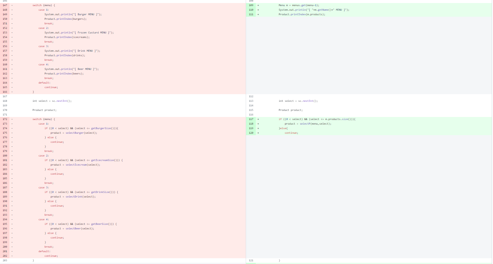 이름 따로 가격 따로 설명 따로 각각 별개의 Static ArrayList에다 넣고 이용했는데 field의 종류와 개수, 사용하는 함수가 모두 동일한 객체들을 Subclass로 세세하게 쪼개니까 너무 비효율적이었음